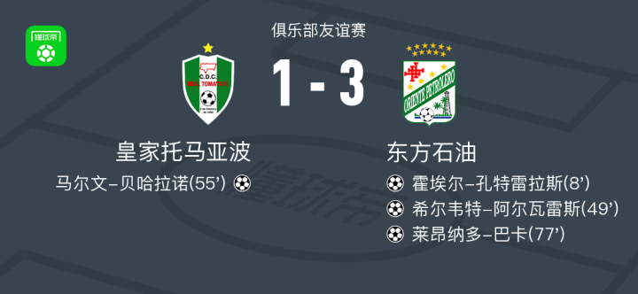 北京时间2月21日俱乐部友谊赛,皇家托马亚波对阵东方石油。皇家托马亚波马尔文-贝哈拉诺破门。东方石油霍埃尔-孔特雷拉斯破门,希尔韦特-阿尔瓦雷斯破门,莱昂纳多-巴卡破门。最终比分皇家托马亚波 1-3 东方石油。