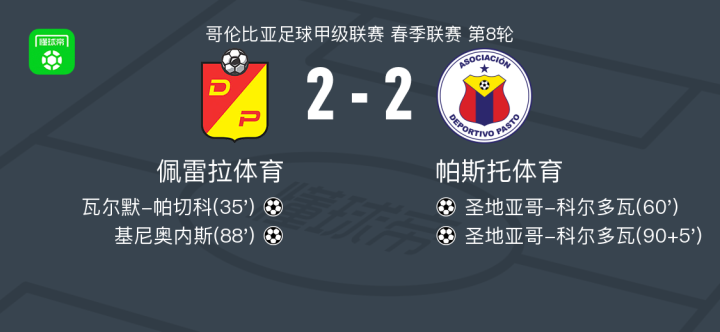 北京时间2月21日哥伦比亚足球甲级联赛 春季联赛 第8轮,佩雷拉体育主场对阵帕斯托体育。佩雷拉体育瓦尔默-帕切科破门,基尼奥内斯破门。帕斯托体育圣地亚哥-科尔多瓦梅开二度。最终比分佩雷拉体育 2-2 帕斯托体育。