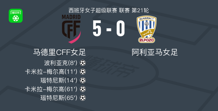 北京时间2月21日西班牙女子超级联赛 联赛 第21轮,马德里CFF女足主场对阵阿利亚马女足。马德里CFF女足波利亚克破门,卡米拉-梅尔高梅开二度,瑙特尼斯梅开二度。最终比分马德里CFF女足 5-0 阿利亚马女足。