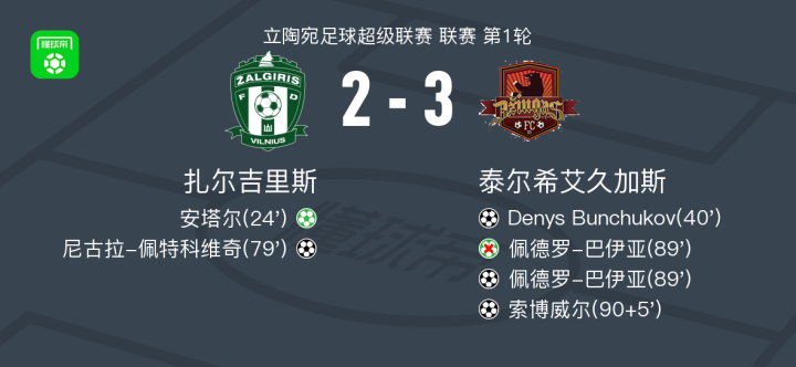 北京时间2月21日立陶宛足球超级联赛 联赛 第1轮,扎尔吉里斯主场对阵泰尔希艾久加斯。扎尔吉里斯安塔尔破门,尼古拉-佩特科维奇破门。泰尔希艾久加斯Denys Bunchukov破门,佩德罗-巴伊亚破门,索博威尔破门。最终比分扎尔吉里斯 2-3 泰尔希艾久加斯。