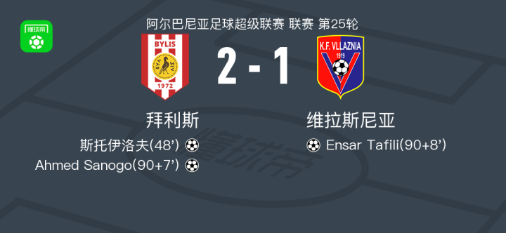 北京时间2月21日阿尔巴尼亚足球超级联赛 联赛 第25轮,拜利斯主场对阵维拉斯尼亚。拜利斯斯托伊洛夫破门,Ahmed Sanogo破门。维拉斯尼亚Ensar Tafili破门。最终比分拜利斯 2-1 维拉斯尼亚。