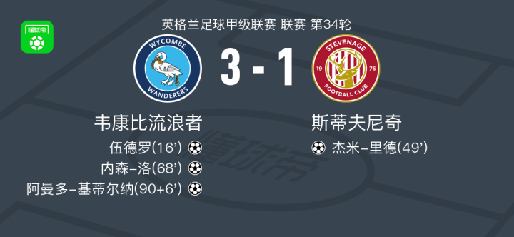 北京时间2月21日英格兰足球甲级联赛 联赛 第34轮,韦康比流浪者主场对阵斯蒂夫尼奇。韦康比流浪者伍德罗破门,内森-洛破门,阿曼多-基蒂尔纳破门。斯蒂夫尼奇杰米-里德破门。最终比分韦康比流浪者 3-1 斯蒂夫尼奇。