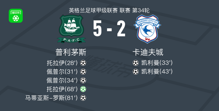 普利茅斯5-2大胜卡迪夫城,托拉伊梅开二度,佩普尔梅开二度