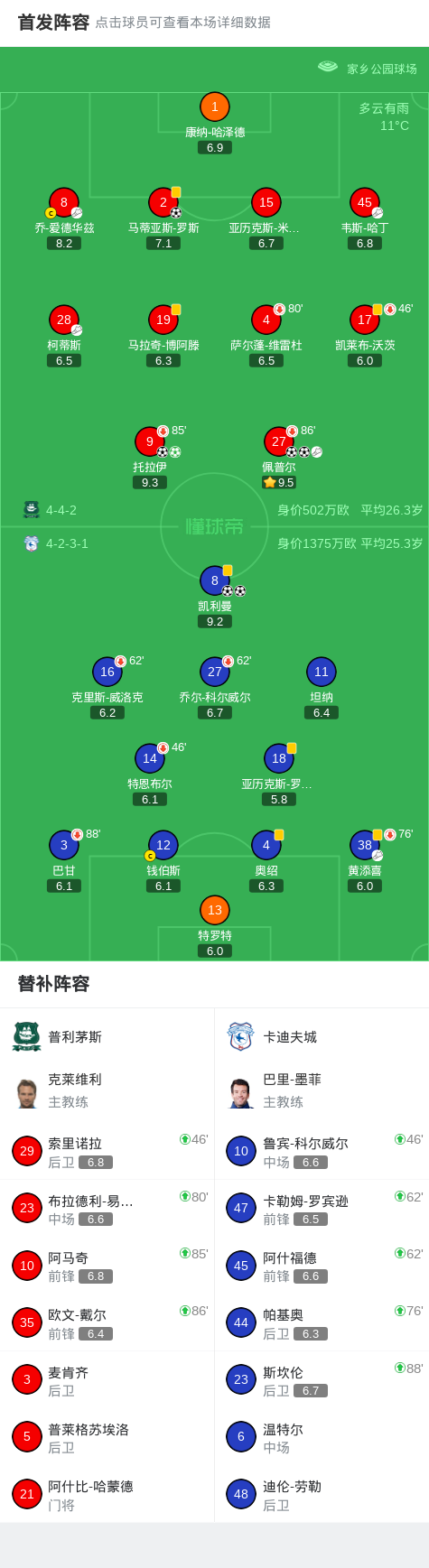 北京时间2月21日英格兰足球甲级联赛 联赛 第34轮,普利茅斯主场对阵卡迪夫城。普利茅斯托拉伊梅开二度,佩普尔梅开二度,马蒂亚斯-罗斯破门。卡迪夫城凯利曼梅开二度。最终比分普利茅斯 5-2 卡迪夫城。