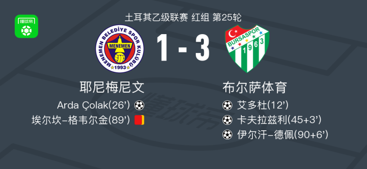 北京时间2月21日土耳其乙级联赛 红组 第25轮,耶尼梅尼文主场对阵布尔萨体育。耶尼梅尼文Arda Çolak破门。布尔萨体育艾多杜破门,卡夫拉兹利破门,伊尔汗-德佩破门。最终比分耶尼梅尼文 1-3 布尔萨体育。