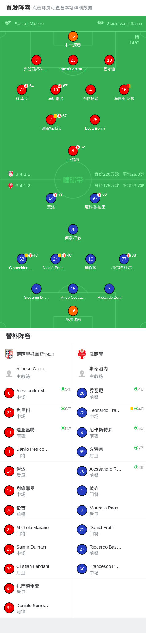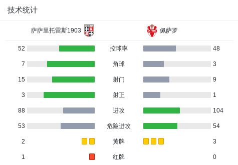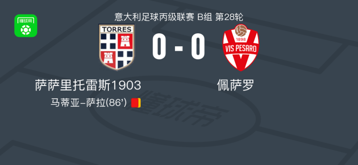 萨萨里托雷斯1903 0-0佩萨罗,双方鏖战90分钟未分胜负战报bot @懂球帝02-21 23:27北京时间2月21日意大利足球丙级联赛 B组 第28轮,萨萨里托雷斯1903主场对阵佩萨罗。最终比分萨萨里托雷斯1903 0-0 佩萨罗。点击查看本场比赛详细数据>>点击查看意丙完整积分榜>>精彩瞬间第86分钟,萨萨里托雷斯1903球队马蒂亚-萨拉吃到第二张黄牌。 球队阵容 技术统计 展开更多
