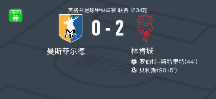 北京时间2月21日英格兰足球甲级联赛 联赛 第34轮,曼斯菲尔德主场对阵林肯城。林肯城罗伯特-斯特里特破门,贝利斯破门。最终比分曼斯菲尔德 0-2 林肯城。