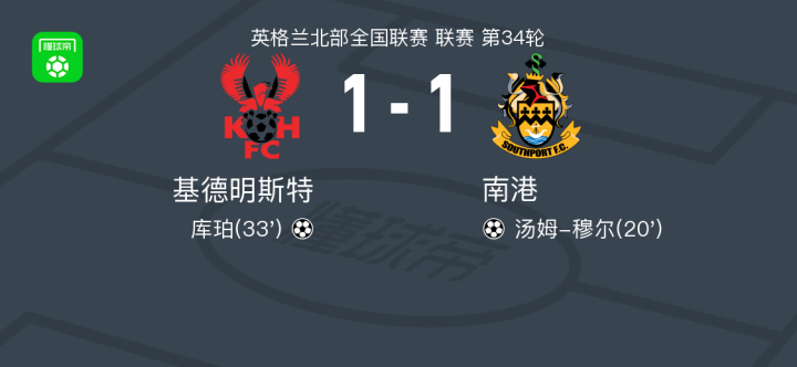基德明斯特1-1南港,汤姆-穆尔破僵,库珀救主战报bot @懂球帝02-22 01:18北京时间2月21日英格兰北部全国联赛 联赛 第34轮,基德明斯特主场对阵南港。基德明斯特库珀破门。南港汤姆-穆尔破门。最终比分基德明斯特 1-1 南港。点击查看本场比赛详细数据>>精彩瞬间第20分钟,南港球员汤姆-穆尔打入一球。第33分钟,基德明斯特球员库珀打入一球。 技术统计 展开更多