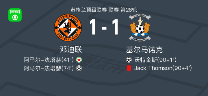 北京时间2月21日苏格兰顶级联赛 联赛 第28轮,邓迪联主场对阵基尔马诺克。邓迪联阿马尔-法塔赫破门。基尔马诺克沃特金斯破门。最终比分邓迪联 1-1 基尔马诺克。