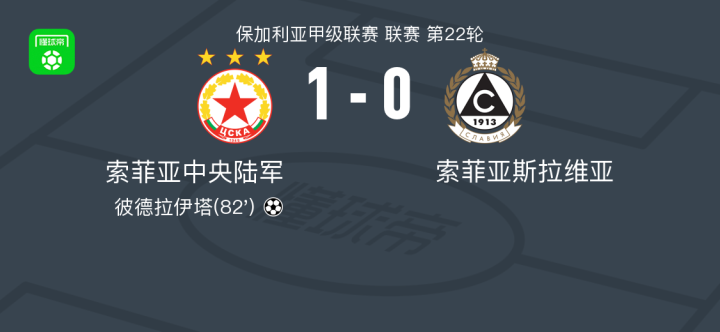 北京时间2月21日保加利亚甲级联赛 联赛 第22轮,索菲亚中央陆军主场对阵索菲亚斯拉维亚。索菲亚中央陆军彼德拉伊塔破门。最终比分索菲亚中央陆军 1-0 索菲亚斯拉维亚。
