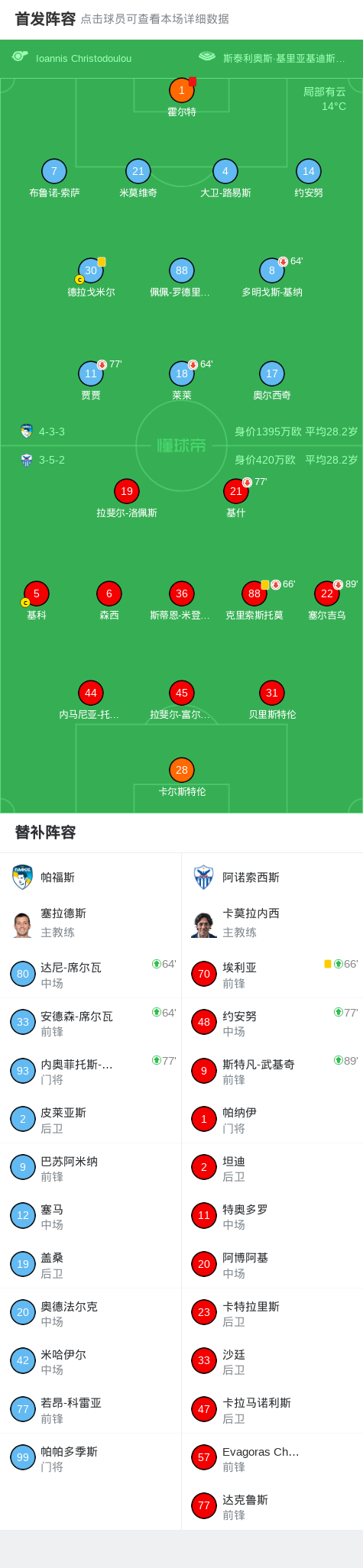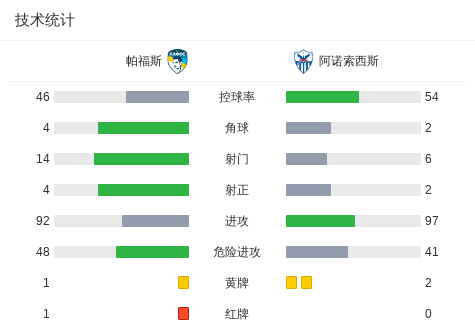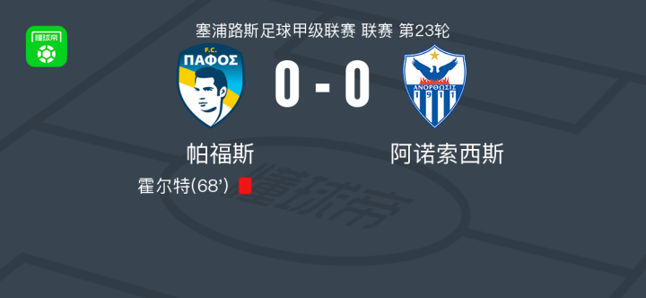 帕福斯0-0阿诺索西斯,两队破门乏术战报bot @懂球帝02-22 02:08北京时间2月22日塞浦路斯足球甲级联赛 联赛 第23轮,帕福斯主场对阵阿诺索西斯。最终比分帕福斯 0-0 阿诺索西斯。点击查看本场比赛详细数据>>点击查看塞浦甲完整积分榜>>精彩瞬间第68分钟,帕福斯球队霍尔特吃到红牌。 球队阵容 技术统计 展开更多