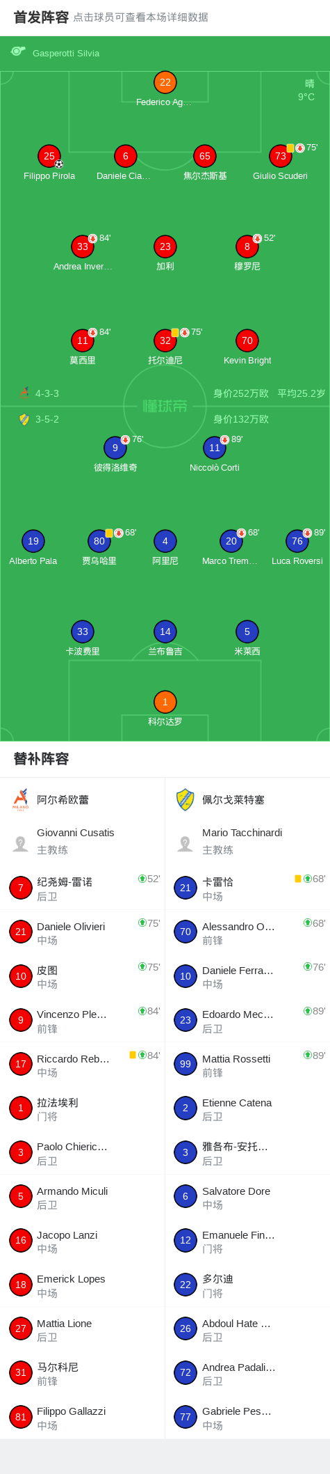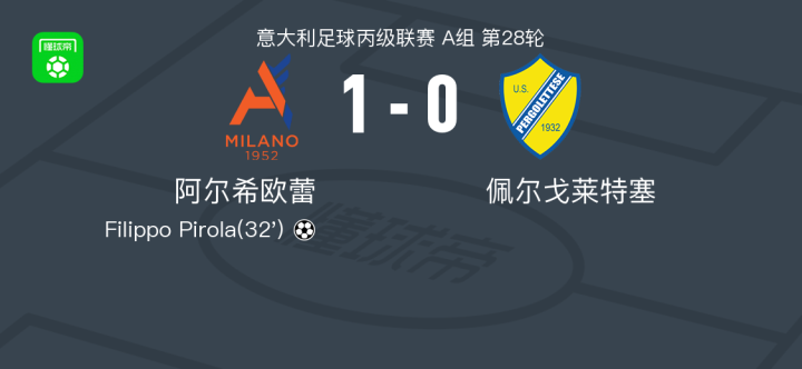 北京时间2月22日意大利足球丙级联赛 A组 第28轮,阿尔希欧蕾主场对阵佩尔戈莱特塞。阿尔希欧蕾Filippo Pirola破门。最终比分阿尔希欧蕾 1-0 佩尔戈莱特塞。