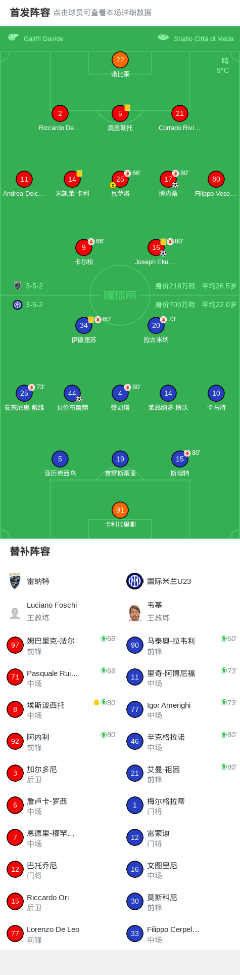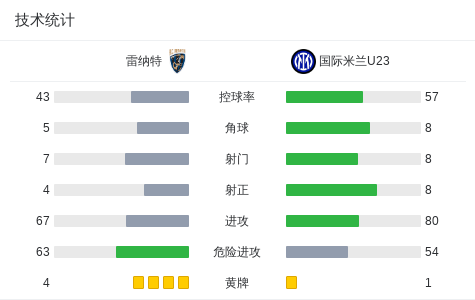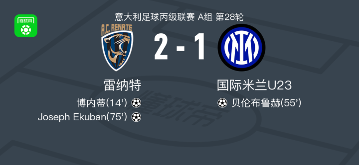 北京时间2月22日意大利足球丙级联赛 A组 第28轮,雷纳特主场对阵国际米兰U23。雷纳特博内蒂破门,Joseph Ekuban破门。国际米兰U23贝伦布鲁赫破门。最终比分雷纳特 2-1 国际米兰U23。