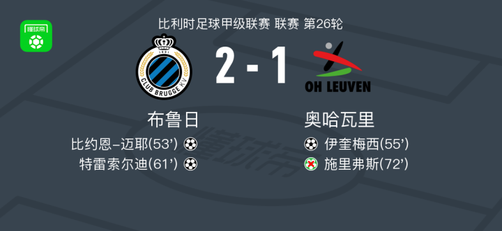 北京时间2月22日比利时足球甲级联赛 联赛 第26轮,布鲁日主场对阵奥哈瓦里。布鲁日比约恩-迈耶破门,特雷索尔迪破门。奥哈瓦里伊奎梅西破门。最终比分布鲁日 2-1 奥哈瓦里。