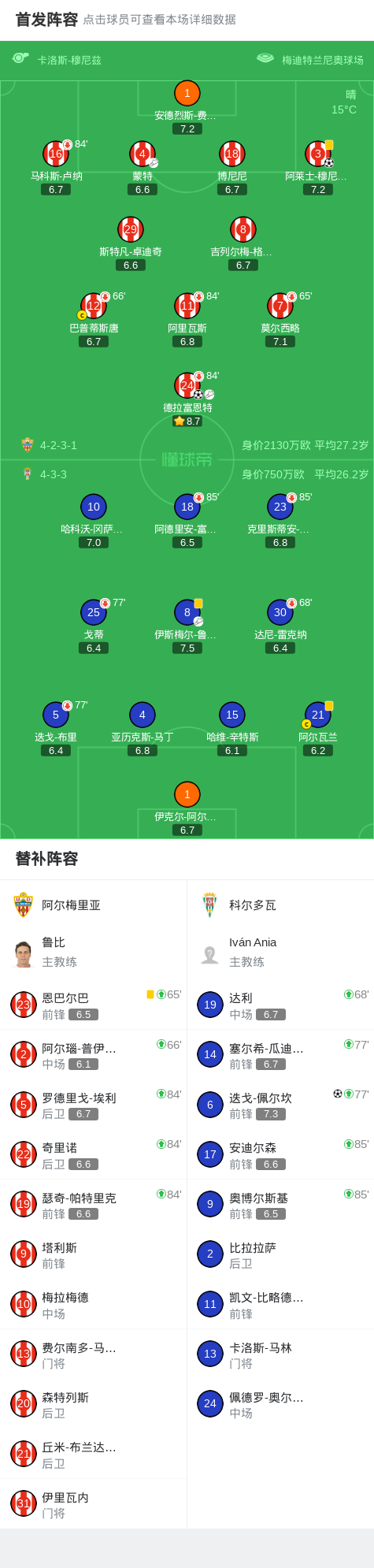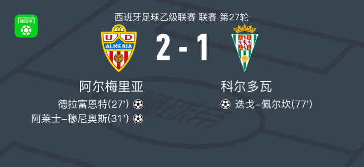 北京时间2月22日西班牙足球乙级联赛 联赛 第27轮,阿尔梅里亚主场对阵科尔多瓦。阿尔梅里亚德拉富恩特破门,阿莱士-穆尼奥斯破门。科尔多瓦迭戈-佩尔坎破门。最终比分阿尔梅里亚 2-1 科尔多瓦。