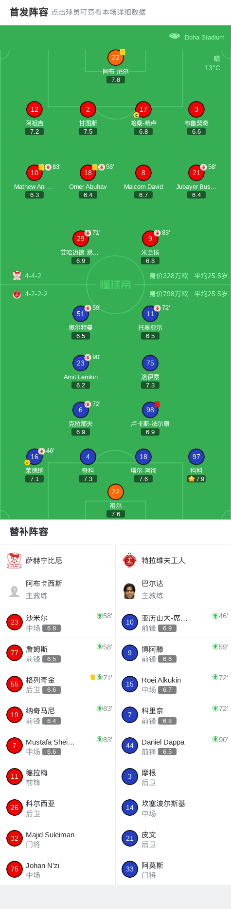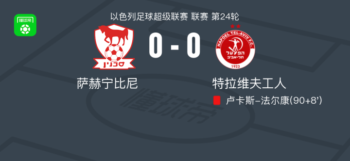 萨赫宁比尼0-0特拉维夫工人,平分秋色战报bot @懂球帝02-22 03:30北京时间2月22日以色列足球超级联赛 联赛 第24轮,萨赫宁比尼主场对阵特拉维夫工人。最终比分萨赫宁比尼 0-0 特拉维夫工人。点击查看本场比赛详细数据>>点击查看以超完整积分榜>>精彩瞬间下半场补时第8分钟,特拉维夫工人球队卢卡斯-法尔康吃到红牌。 球队阵容 技术统计 展开更多