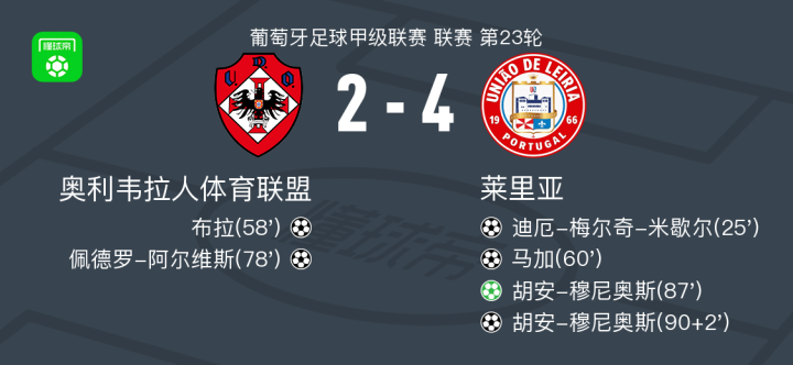 北京时间2月22日葡萄牙足球甲级联赛 联赛 第23轮,奥利韦拉人体育联盟主场对阵莱里亚。奥利韦拉人体育联盟布拉破门,佩德罗-阿尔维斯破门。莱里亚迪厄-梅尔奇-米歇尔破门,马加破门,胡安-穆尼奥斯梅开二度。最终比分UD奥利维拉人 2-4 莱里亚。