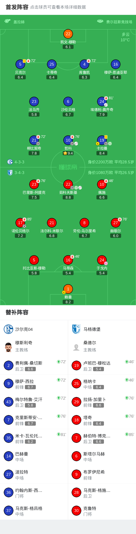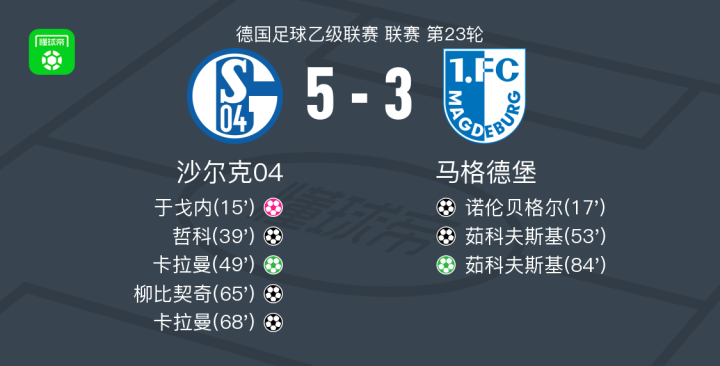 北京时间2月22日德国足球乙级联赛 联赛 第23轮,沙尔克04主场对阵马格德堡。沙尔克04哲科破门,柳比契奇破门,卡拉曼梅开二度。马格德堡诺伦贝格尔破门,茹科夫斯基梅开二度,于戈内自摆乌龙。最终比分沙尔克 5-3 马格德堡。