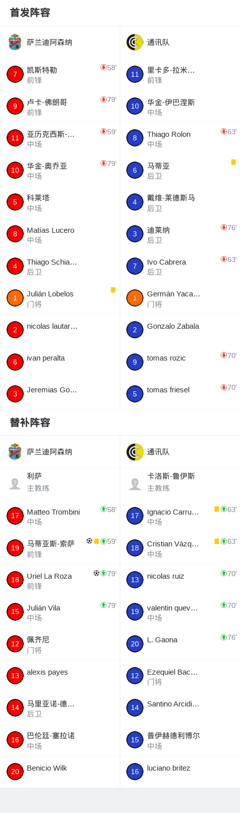 北京时间2月22日阿根廷足球乙级大都会区联赛 春季联赛 第2轮,萨兰迪阿森纳主场对阵通讯队。萨兰迪阿森纳马蒂亚斯-索萨破门,Uriel La Roza破门。最终比分萨兰迪阿森纳 2-0 通讯队。
