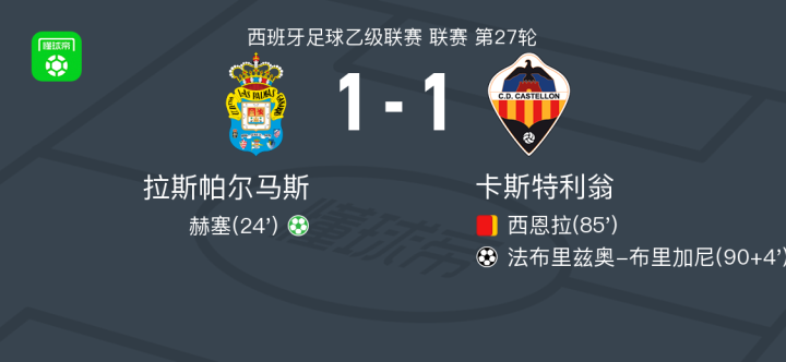北京时间2月22日西班牙足球乙级联赛 联赛 第27轮,拉斯帕尔马斯主场对阵卡斯特利翁。拉斯帕尔马斯赫塞破门。卡斯特利翁法布里兹奥-布里加尼破门。最终比分拉斯帕尔马斯 1-1 卡斯迪隆。
