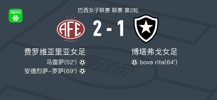 北京时间2月22日巴西女子联赛 联赛 第2轮,费罗维亚里亚女足主场对阵博塔弗戈女足。费罗维亚里亚女足马雷萨破门,安德烈萨-罗萨破门。博塔弗戈女足bova rita破门。最终比分费罗维亚里亚女足 2-1 博塔弗戈女足。