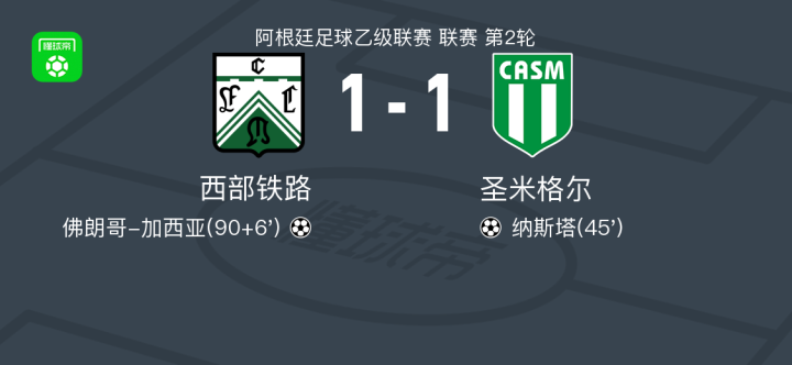 北京时间2月22日阿根廷足球乙级联赛 联赛 第2轮,西部铁路主场对阵圣米格尔。西部铁路佛朗哥-加西亚破门。圣米格尔纳斯塔破门。最终比分西部铁路 1-1 圣米格尔。