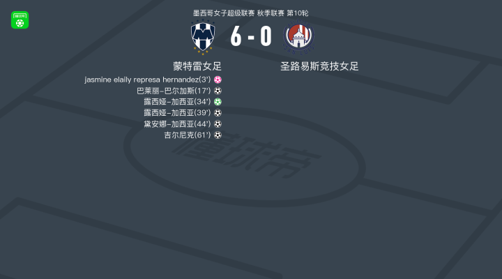 北京时间2月22日墨西哥女子超级联赛 秋季联赛 第10轮,蒙特雷女足主场对阵圣路易斯竞技女足。蒙特雷女足巴莱丽-巴尔加斯破门,露西娅-加西亚梅开二度,黛安娜-加西亚破门,吉尔尼克破门。圣路易斯竞技女足jasmine elaily represa hernandez自摆乌龙。最终比分蒙特雷女足 6-0 圣路易斯竞技女足。