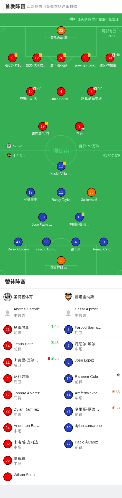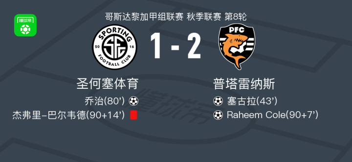 普塔雷纳斯2-1圣何塞体育取哥斯甲3连胜,Raheem Cole建功,塞古拉破门