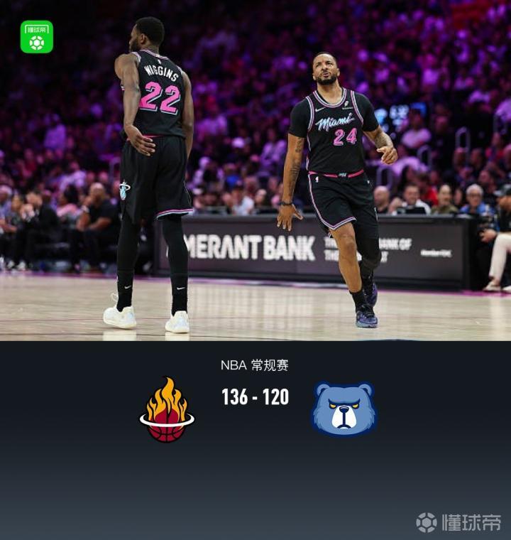 第四节热火阿德巴约拿下7分,灰熊GG-杰克逊拿下8分,最终热火136-120战胜灰熊