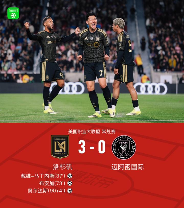 迈阿密国际客场0-3洛杉矶遭开门黑,孙兴慜助攻,布安加传射