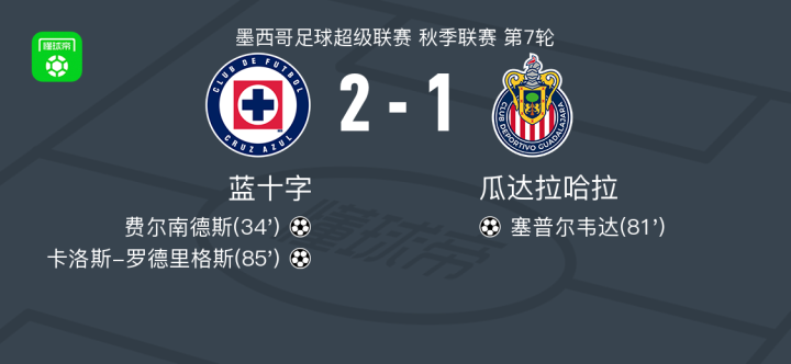 蓝十字2-1瓜达拉哈拉,卡洛斯-罗德里格斯破门,费尔南德斯建功