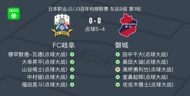 点球大战FC岐阜5-4磐城,穆罕默德-瓦德点球罚进,高桥勇利也失点战报bot @懂球帝02-22 15:03北京时间2月22日日本职业J2/J3百年构想联赛 东区B组 第3轮,FC岐阜主场对阵磐城。最终比分FC岐阜 5-4 磐城。点击查看本场比赛详细数据>>点击查看日职J2/J3完整积分榜>> 球队阵容 技术统计 展开更多
