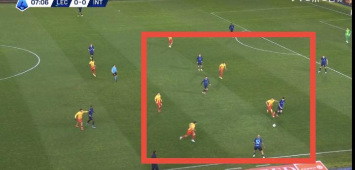 本场莱切坐镇主场,不像客场屯兵低位,扎紧篱笆,而是适时的采取高位压迫,凶狠争抢中场2点,围剿国米锋线