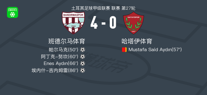 北京时间2月22日土耳其足球甲级联赛 联赛 第27轮,班德尔马体育主场对阵哈塔伊体育。班德尔马体育帕尔马克破门,阿丁克-努坎破门,Enes Aydın破门,埃内什-吉内姆雷破门。最终比分班德尔马体育 4-0 哈塔伊体育。
