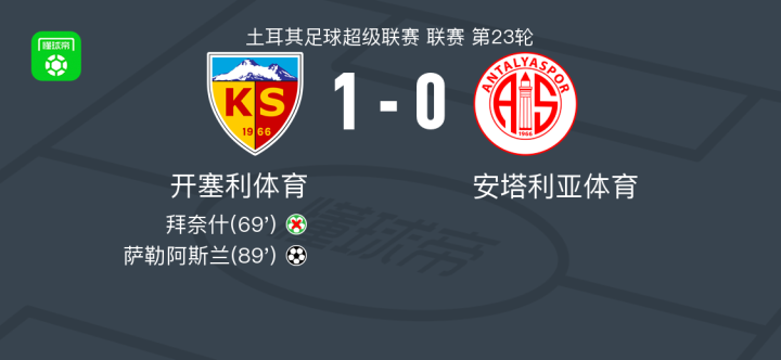北京时间2月22日土耳其足球超级联赛 联赛 第23轮,开塞利体育主场对阵安塔利亚体育。开塞利体育萨勒阿斯兰破门。最终比分开塞利体育 1-0 安塔利亚体育。