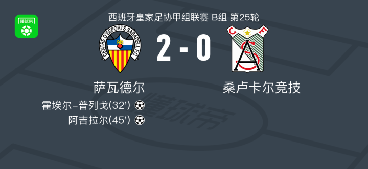 北京时间2月22日西班牙皇家足协甲组联赛 B组 第25轮,萨瓦德尔主场对阵桑卢卡尔竞技。萨瓦德尔霍埃尔-普列戈破门,阿吉拉尔破门。最终比分萨瓦德尔 2-0 桑卢卡尔竞技。