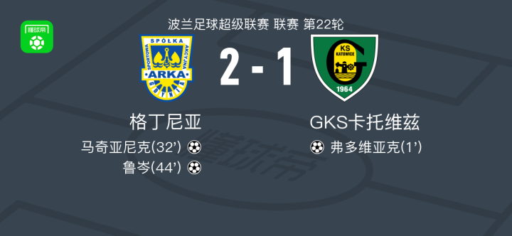 北京时间2月22日波兰足球超级联赛 联赛 第22轮,格丁尼亚主场对阵GKS卡托维兹。格丁尼亚马奇亚尼克破门,鲁岑破门。GKS卡托维兹弗多维亚克破门。最终比分格丁尼亚 2-1 GKS卡托维兹。