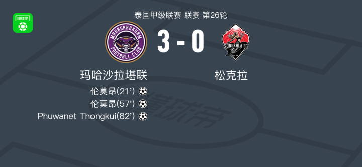 北京时间2月22日泰国甲级联赛 联赛 第26轮,玛哈沙拉堪联主场对阵松克拉。玛哈沙拉堪联伦莫昂梅开二度,Phuwanet Thongkui破门。最终比分玛哈沙拉堪联 3-0 松克拉。