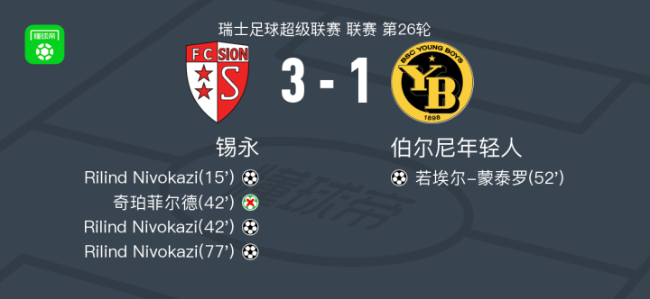 北京时间2月22日瑞士足球超级联赛 联赛 第26轮,锡永主场对阵伯尔尼年轻人。锡永Rilind Nivokazi帽子戏法。伯尔尼年轻人若埃尔-蒙泰罗破门。最终比分锡永 3-1 伯尔尼年轻人。