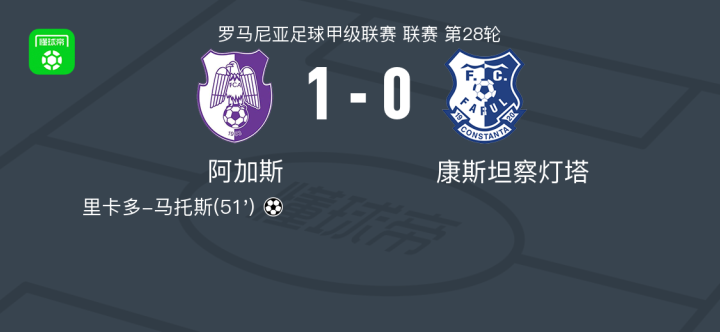 北京时间2月22日罗马尼亚足球甲级联赛 联赛 第28轮,阿加斯主场对阵康斯坦察灯塔。阿加斯里卡多-马托斯破门。最终比分阿加斯 1-0 康斯坦察灯塔。