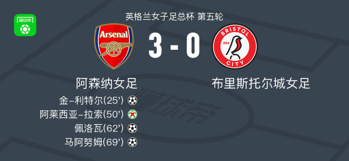 北京时间2月22日英格兰女子足总杯 第五轮,阿森纳女足对阵布里斯托尔城女足。阿森纳女足金-利特尔破门,佩洛瓦破门,马阿努姆破门。最终比分阿森纳女足 3-0 布里斯托尔城女足。