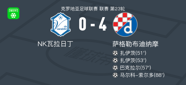 北京时间2月22日克罗地亚足球联赛 联赛 第23轮,NK瓦拉日丁主场对阵萨格勒布迪纳摩。萨格勒布迪纳摩扎伊茨梅开二度,巴克拉尔破门,马尔科-索尔多破门。最终比分NK瓦拉日丁 0-4 萨格勒布迪纳摩。