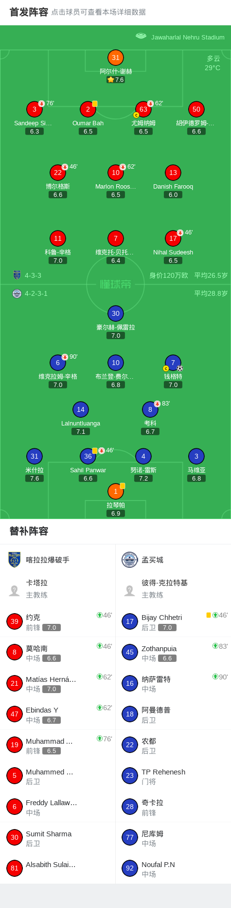 孟买城1-0喀拉拉爆破手,钱格特打进全场唯一进球战报bot @懂球帝02-22 23:54北京时间2月22日印度足球超级联赛 联赛,喀拉拉爆破手主场对阵孟买城。孟买城钱格特破门。最终比分喀拉拉爆破手 0-1 孟买城。点击查看本场比赛详细数据>>点击查看印度超完整积分榜>>精彩瞬间第26分钟,孟买城球员豪尔赫-佩雷拉将点球罚丢。第47分钟,孟买城球员钱格特打入一球。 球队阵容 技术统计 展开更多