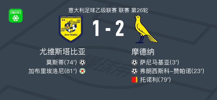 北京时间2月22日意大利足球乙级联赛 联赛 第26轮,尤维斯塔比亚主场对阵摩德纳。尤维斯塔比亚莫斯蒂破门。摩德纳萨尼马基亚破门,弗朗西斯科-赞帕诺破门。最终比分尤维斯塔比亚 1-2 摩德纳。