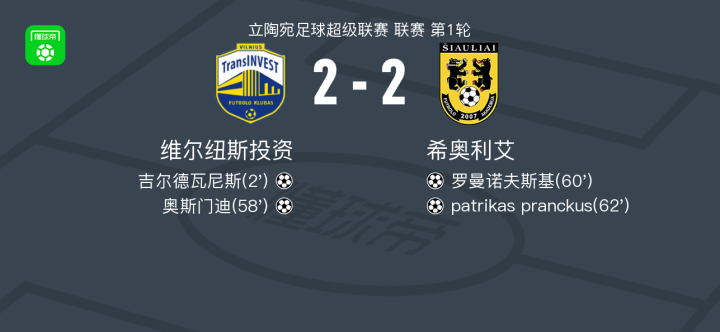 北京时间2月22日立陶宛足球超级联赛 联赛 第1轮,维尔纽斯投资主场对阵希奥利艾。维尔纽斯投资吉尔德瓦尼斯破门,奥斯门迪破门。希奥利艾罗曼诺夫斯基破门,patrikas pranckus破门。最终比分维尔纽斯投资 2-2 希奥利艾。