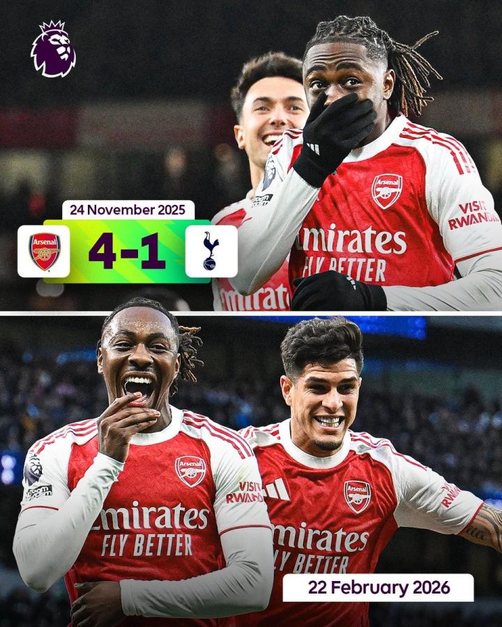 英超第27轮,阿森纳客场对阵热刺,上半场埃泽打入一球,至此,埃泽本赛季英超对阵热刺已打入4球,成为第二位单赛季联赛北伦敦德比打入至少4球的球员。