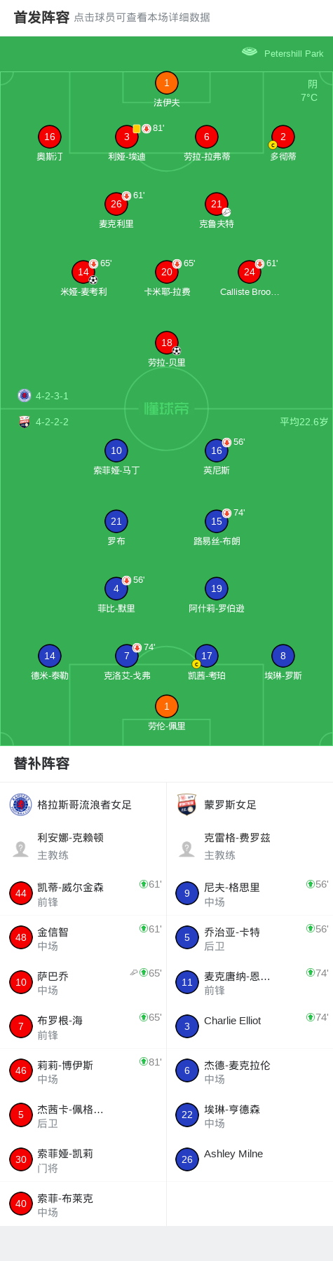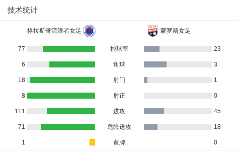 格拉斯哥流浪者女足2-0蒙罗斯女足,米娅-麦考利破门,劳拉-贝里锁定胜局