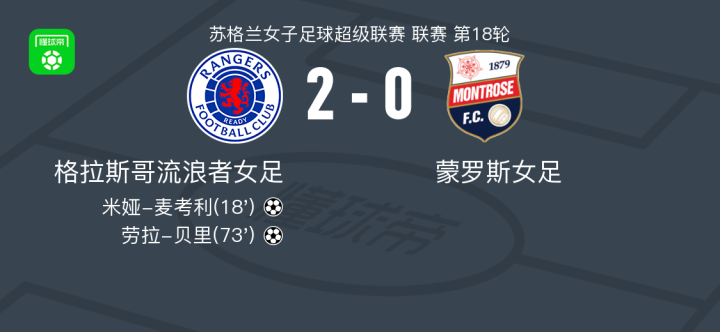 北京时间2月23日苏格兰女子足球超级联赛 联赛 第18轮,格拉斯哥流浪者女足主场对阵蒙罗斯女足。格拉斯哥流浪者女足米娅-麦考利破门,劳拉-贝里破门。最终比分格拉斯哥流浪者女足 2-0 蒙罗斯女足。
