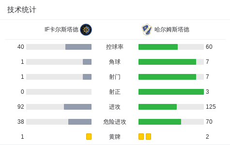 哈尔姆斯塔德1-0IF卡尔斯塔德,阿兰松一击制胜战报bot @懂球帝02-23 01:53北京时间2月23日瑞典杯 小组赛 第1轮,IF卡尔斯塔德对阵哈尔姆斯塔德。哈尔姆斯塔德阿兰松破门。最终比分IF卡尔斯塔德 0-1 哈尔姆斯塔德。点击查看本场比赛详细数据>>精彩瞬间第58分钟,哈尔姆斯塔德球员阿兰松打入一球。 技术统计 展开更多