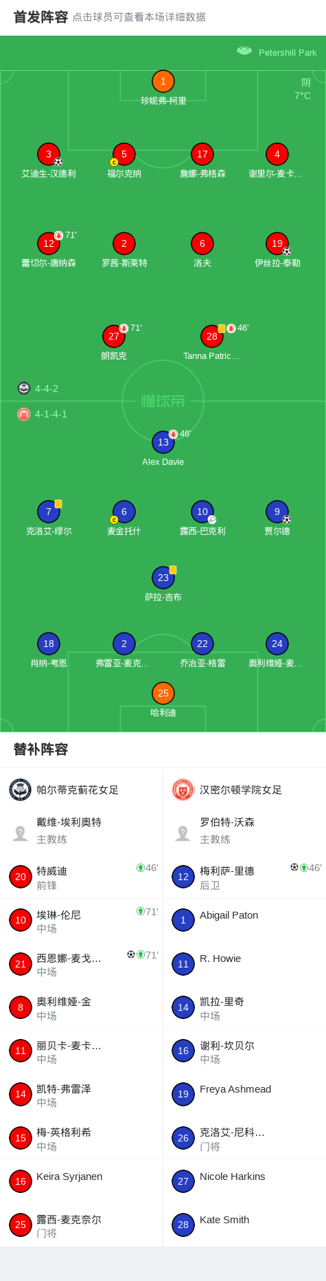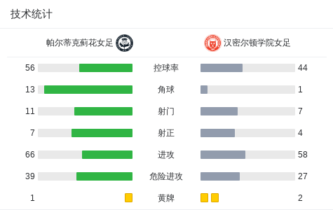 上半场补时第2分钟,帕尔蒂克蓟花女足球员艾迪生-汉德利打入一球。